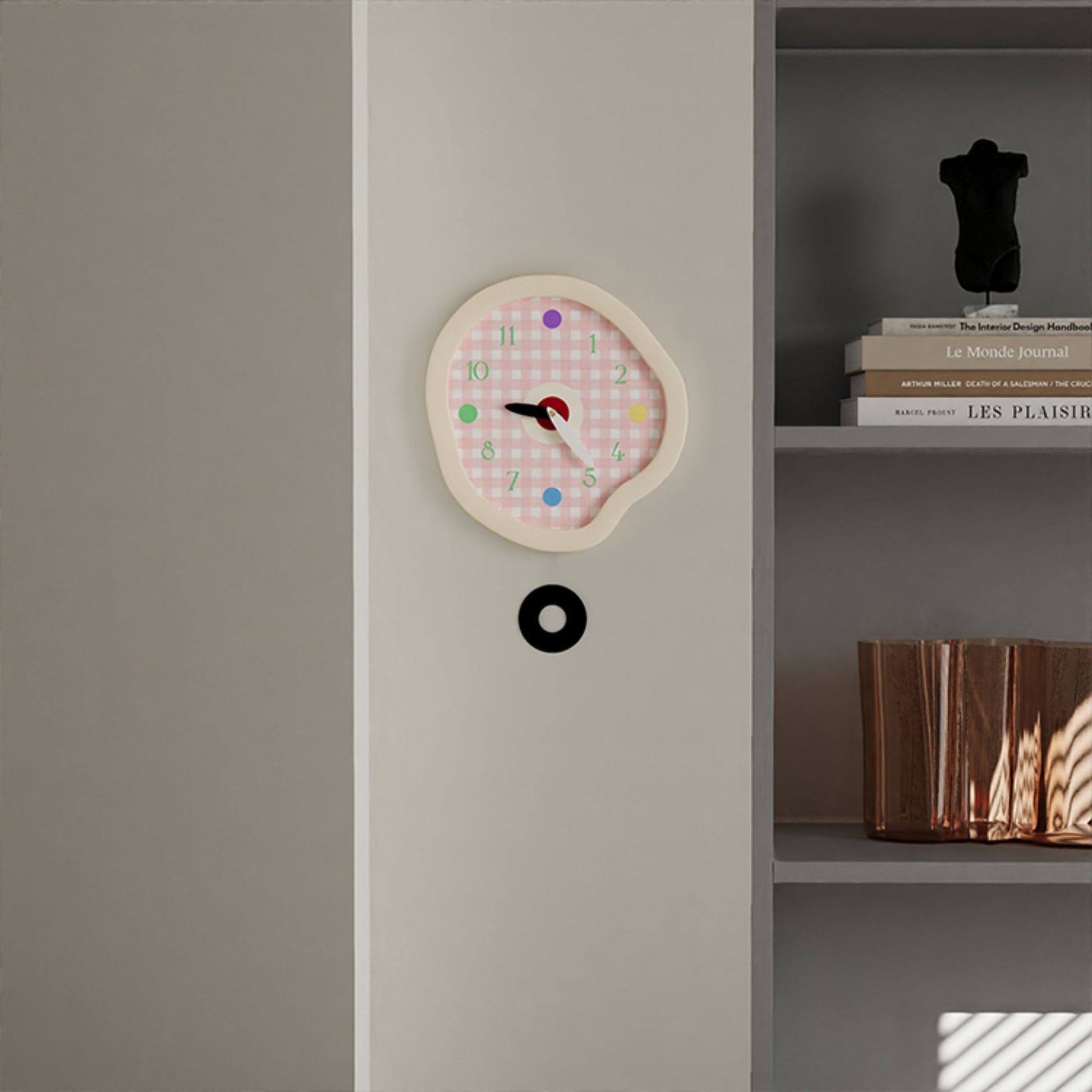 Add a dose of charm and cheer to your walls with this Creamy Gingham Wall Clock. Featuring a soft wavy frame and a pastel checkered face with colorful dot hour markers, this clock perfectly captures the whimsical spirit of modern Nordic decor. Available in both pendulum and non-pendulum versions, it’s a unique way to tell time while brightening up your living room, bedroom, kitchen, or entryway. The irregular shape and candy-tone details make it a conversation-starting art piece as much as a functional timekeeper.